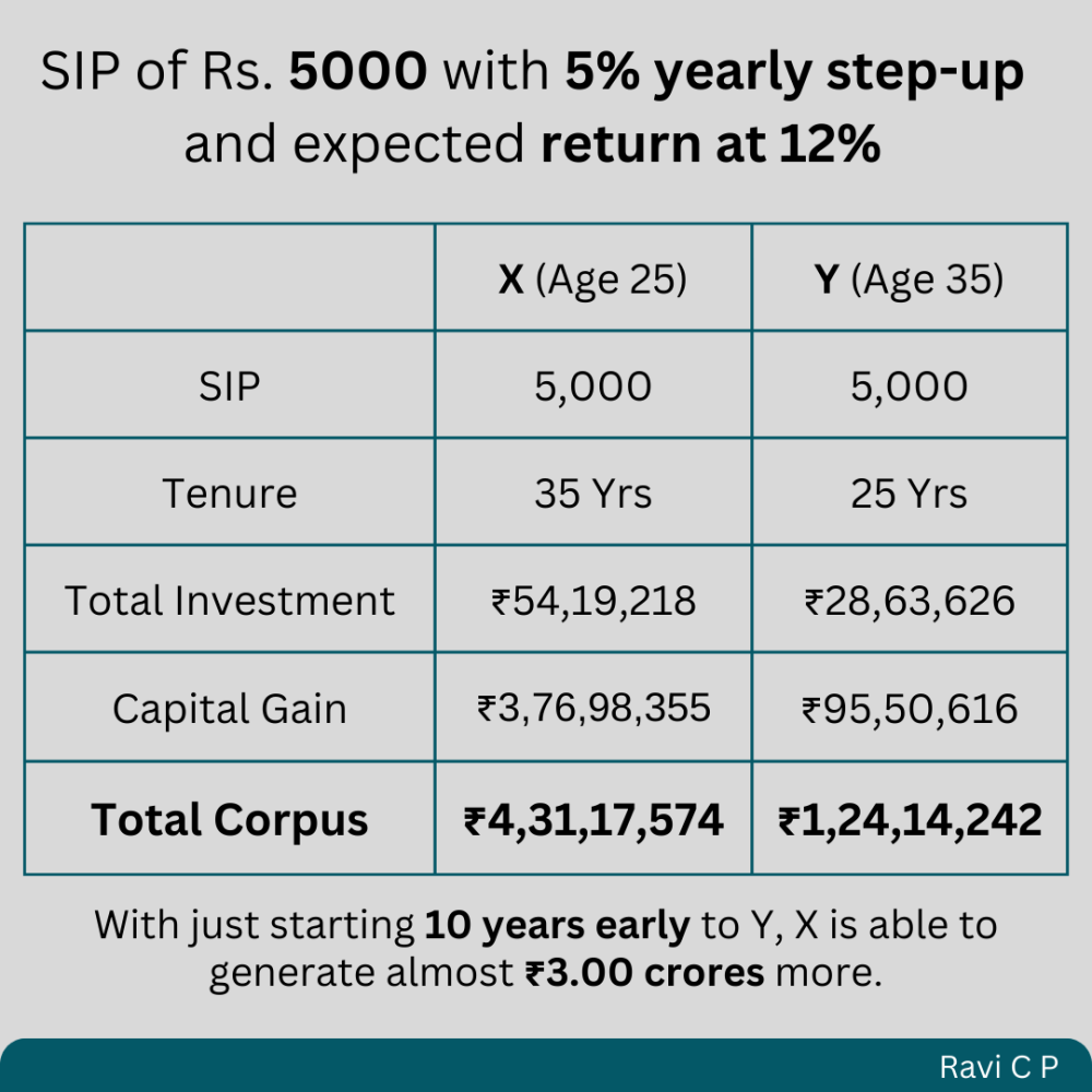 Why start early? Let’s take an example of two individuals, X and Y. Both X and Y started investing Rs. ₹5000 in monthly SIP, and they planned to increase the investment by 5% every year. So the first 12 SIPs would be ₹5000, and then the next 12 SIPs would be ₹5250, and so on. However, X started his investment journey at the age of 25 and Y at the age of 35. Both of them have planned to invest till they reach the age of 60, and we assume a 12% annualized return on investment, which is lower than the 17% annualized return given by major mutual funds in the last 25 years.