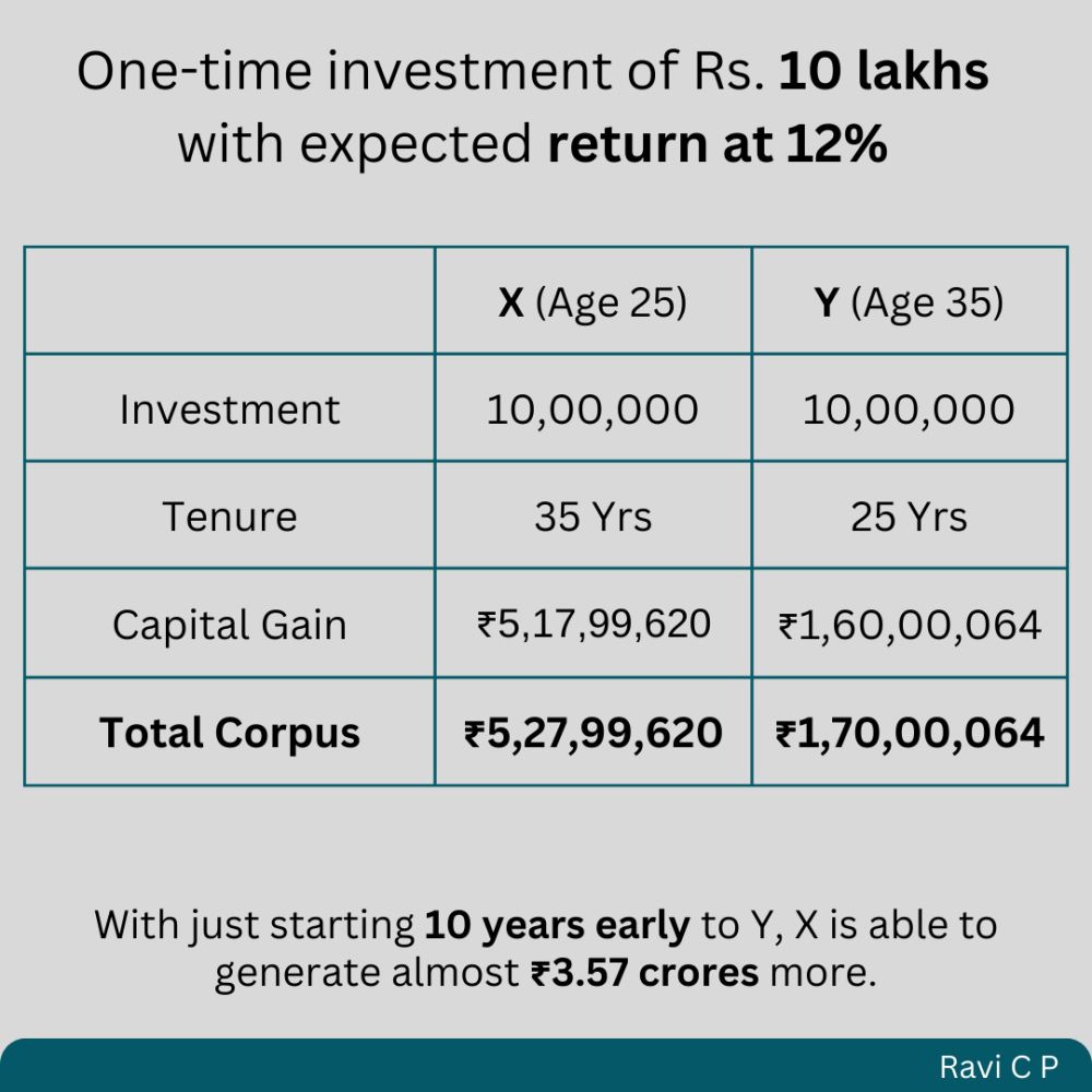 Just see the difference of starting 10 years earlier. Here X is able to generate ₹3.57 crore more than Y.